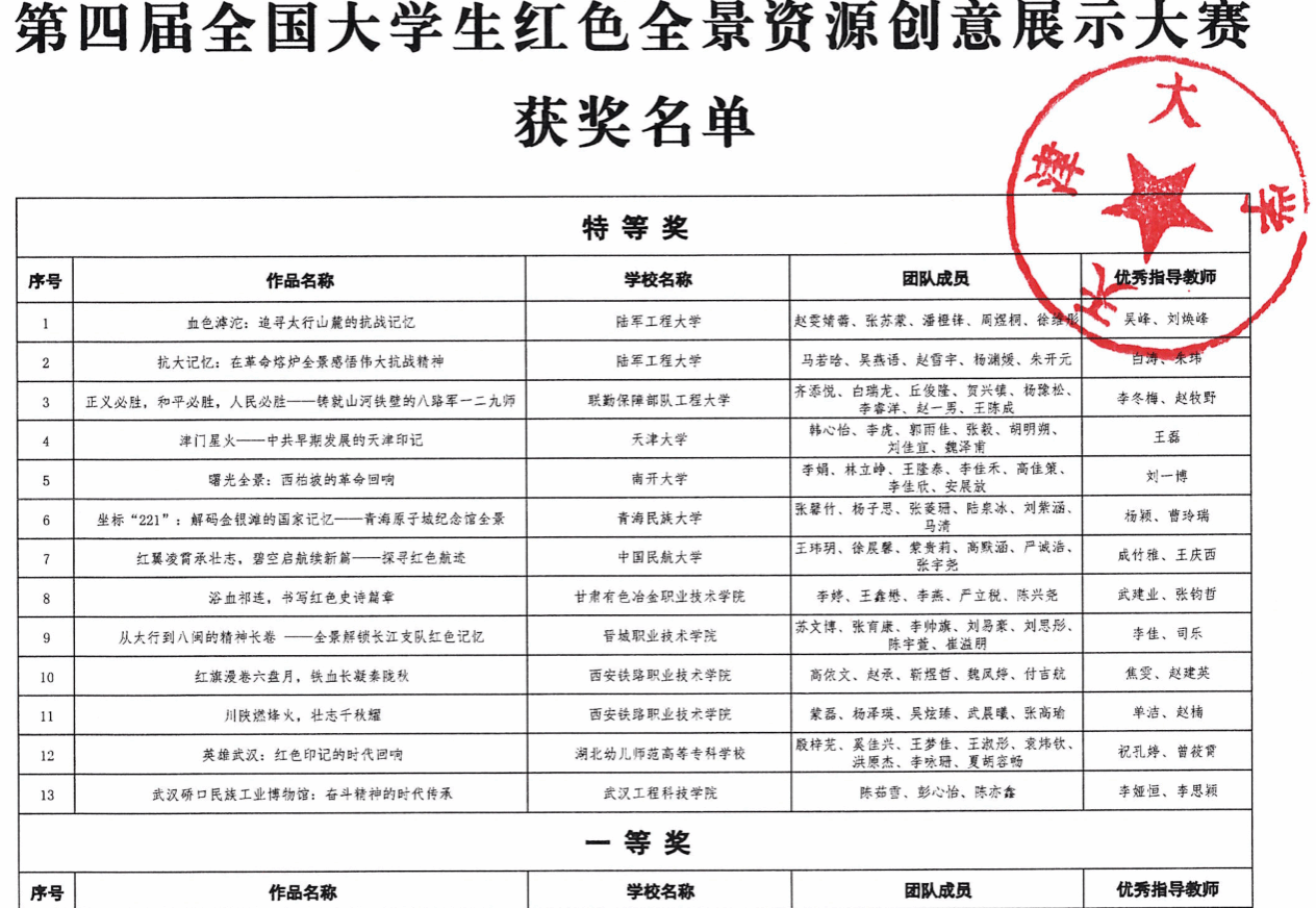 近日,在马克思主义学院教师的专业指导和全程带领下,我校多支学生团队在第四届全国大学生红色全景资源创意展示大赛中表现突出,成果丰硕:荣获一等奖1个,二等奖8个,三等奖1个,充分展现了我校师生扎实的马克思主义理论素养与深厚的爱国主义情怀。