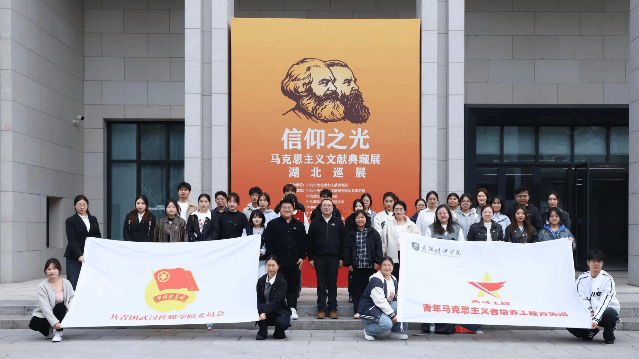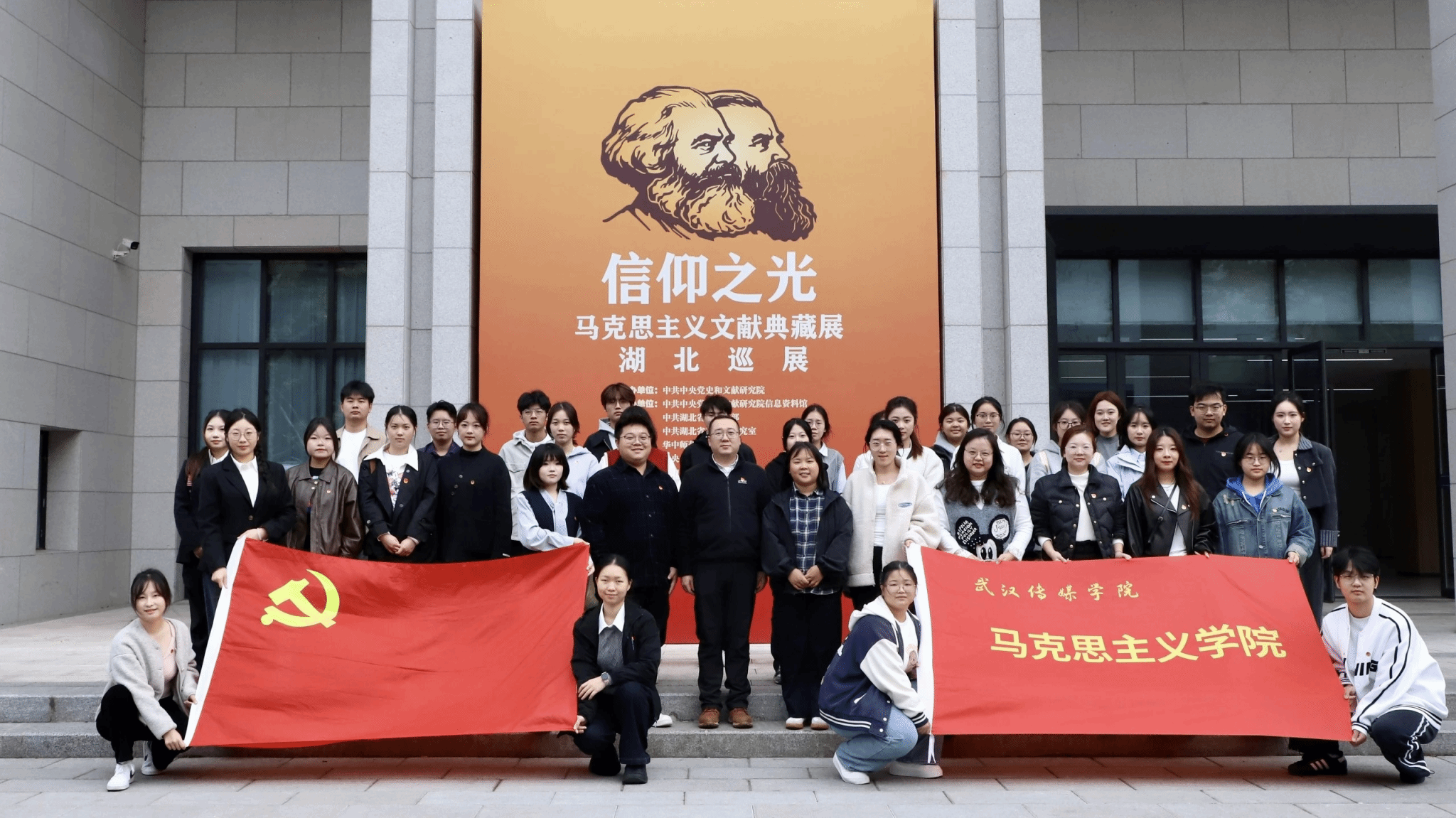 为深化 “青马工程” 育人实效,推动马克思主义理论教育与实践育人深度融合,2025 年 11 月 11 日下午,马克思主义学院协同校团委组织 “青马工程” 菁英班学员及学生骨干代表 ,赴华中师范大学参观 “信仰之光 —— 马克思主义文献典藏展” 湖北巡展。实践活动由党委组织部部长李奉天老师、校团委副书记蒋璐璐老师、校团委华震东老师带队。马院祝庆、杨竹茹、王文瑶三位老师全程参与,以理论讲解、现场解读、专题研讨相结合的方式,为青年学子打造了一堂沉浸式、立体化的 “行走的思政课”。